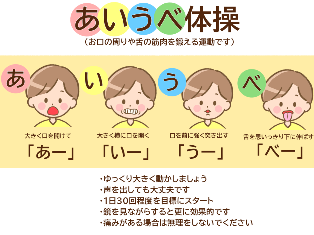 今までにも何度か、「口腔機能を改善する効果がある」とお話してきた”あいうべ体操”ですが、歯科では、口腔機能を改善する目的であいうべ体操を取り入れることで、以下のような効果をもたらします。
