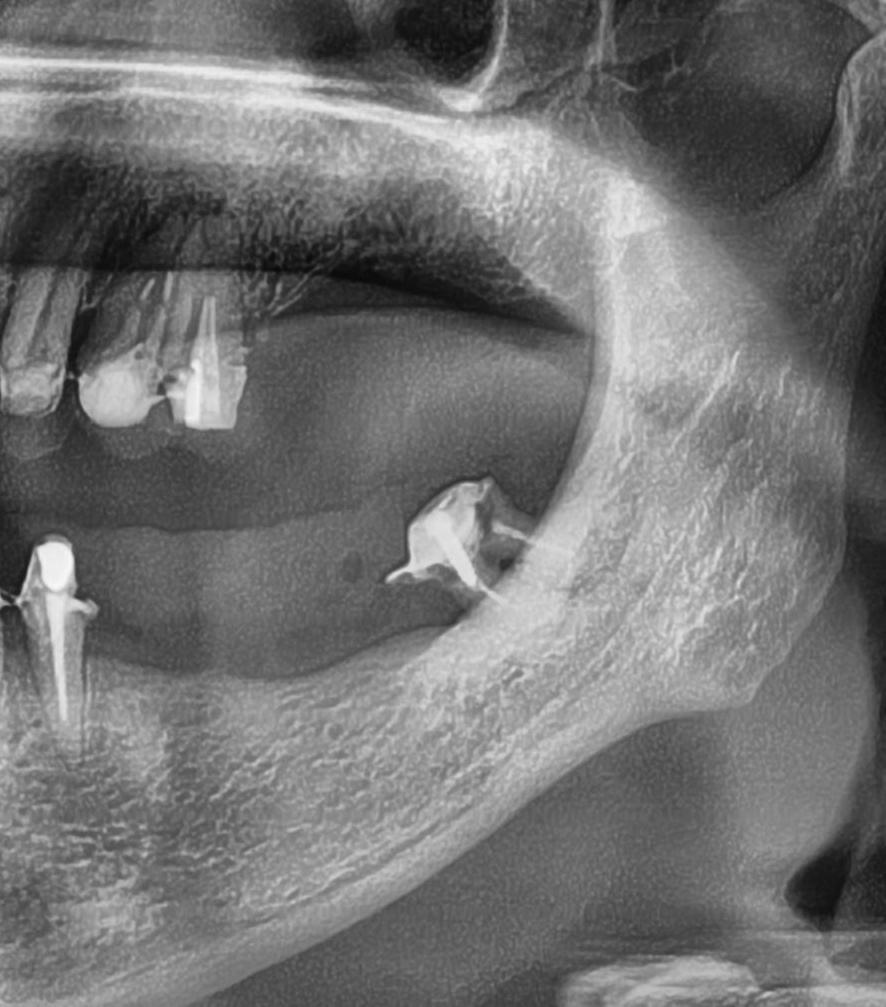 しっかりとインプラント埋め込まれた後は、動揺がないか、噛んだ時に当たらないかなどを確認して、最後にパノラマ写真を撮影して今回のオペは終了となりました。