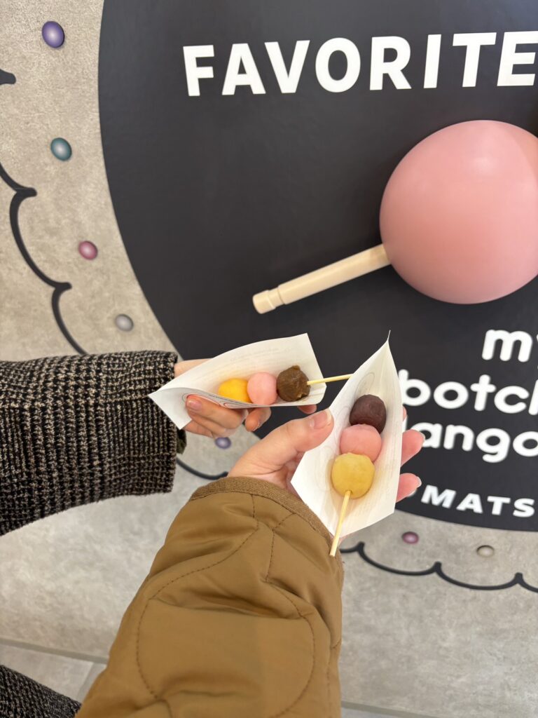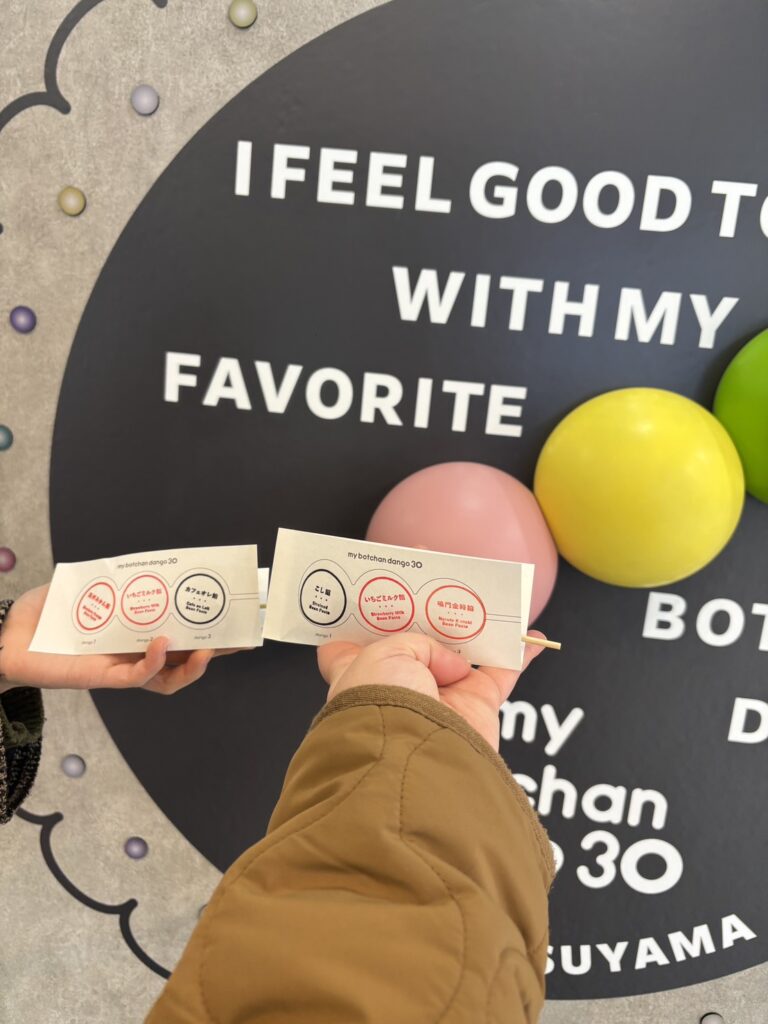 コラム一覧 久しぶりの道後満喫 2026.02.27 みなさんこんにちは! 伊藤歯科医院受付の清家です! 先日、岡山から親友が遊びに来てくれたので道後へ行きました! 私も久しぶりの道後だったのですが、おしゃれなお店がたくさん増えててびっくりしました! ぼっちゃん団子を自分で作るお店に行きました♪ 好きな味を自分で選んで串にするスタイルで、お気に入りの味がたくさんあって迷いました〜! 友だちが作ったぼっちゃん団子もとても美味しそうでした〜!! そのあとはみかんジュースの飲み比べをしたり、足湯に浸かったりとゆったりとした時間を過ごせました〜!!