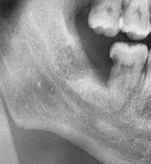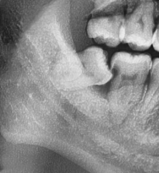 次にパノラマ写真を撮影してみると、右下の親知らずは手前の歯の歯を押すように斜めに生えているのが確認できました。