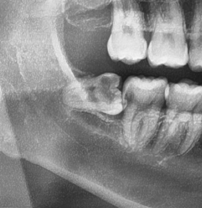 確認してみると、右下の親知らずが歯茎の中でやや斜めに埋まっています。