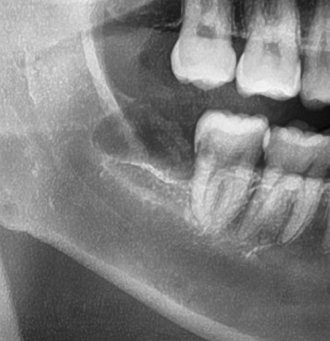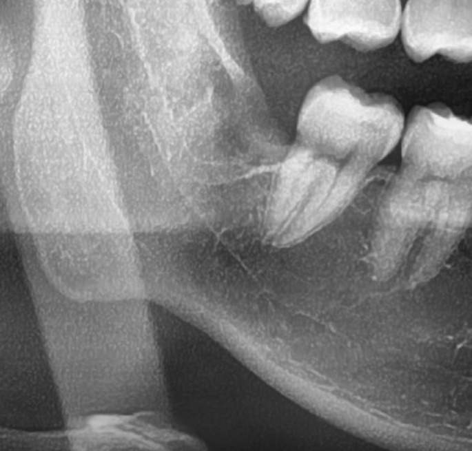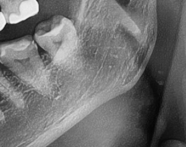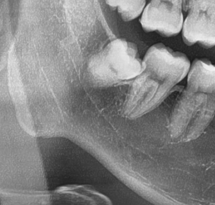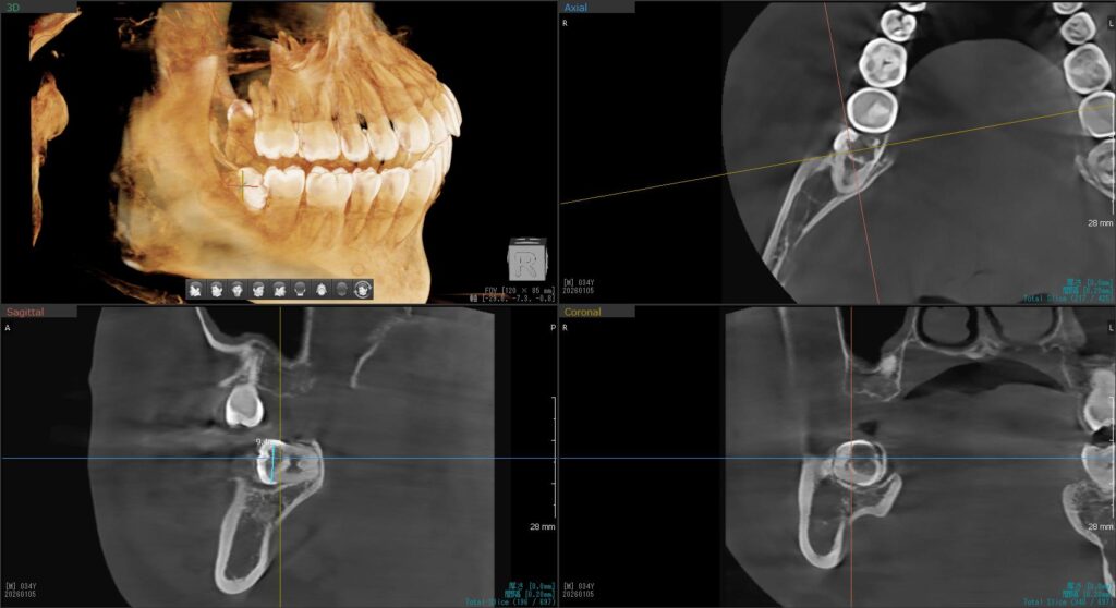 左下の親知らずは一部が見えており、レントゲンで詳しく確認すると、手前の歯を押すように斜めに生えていました。